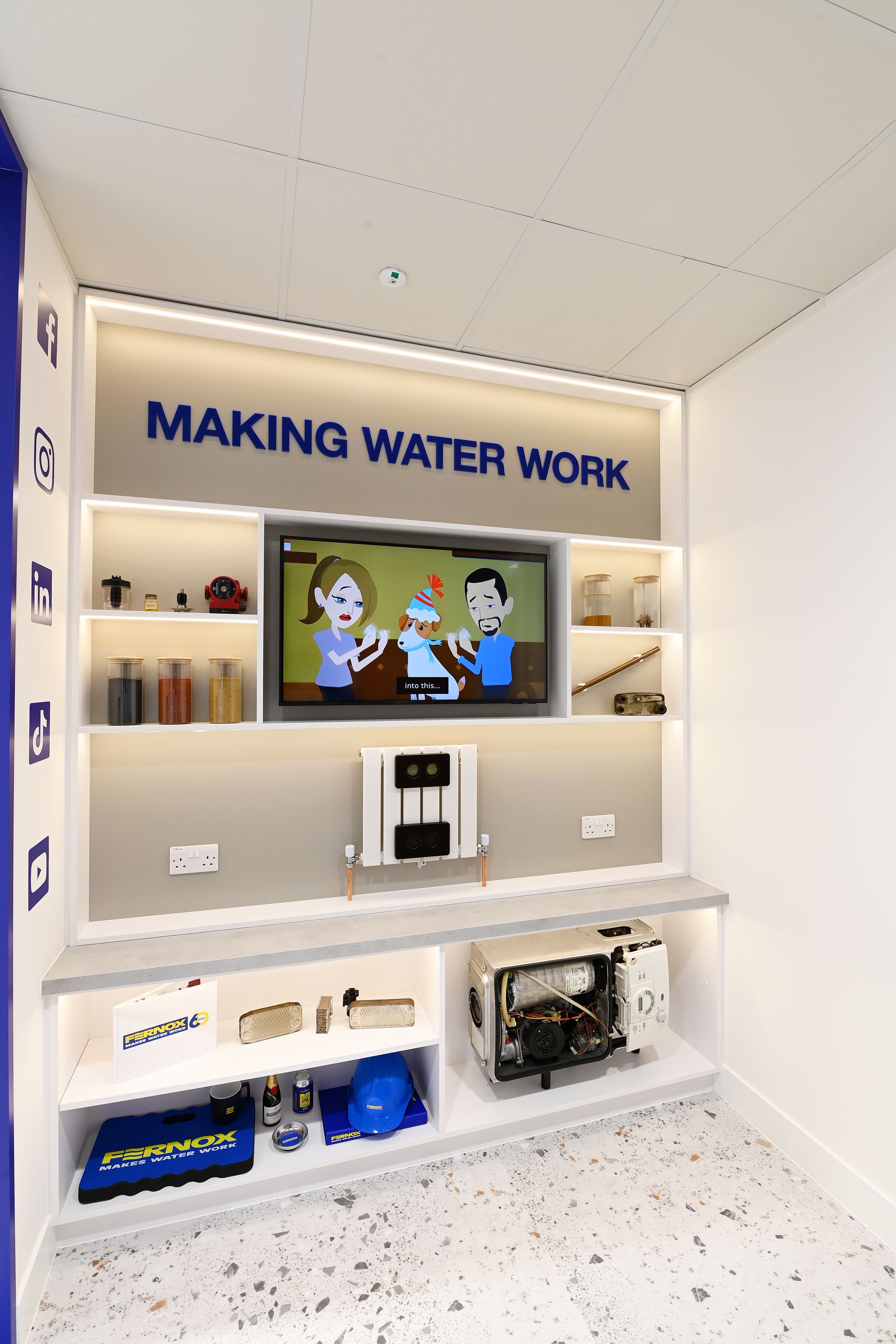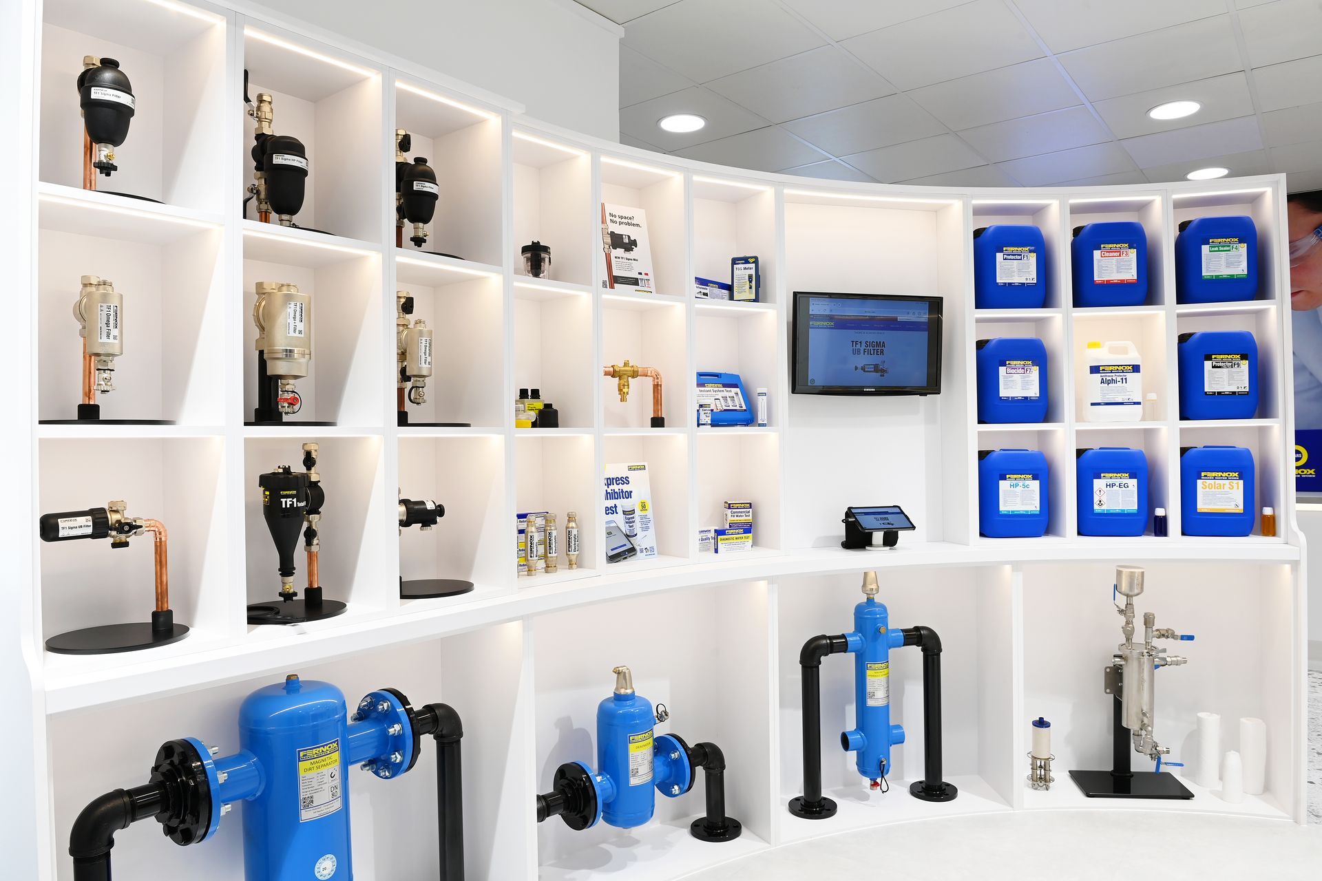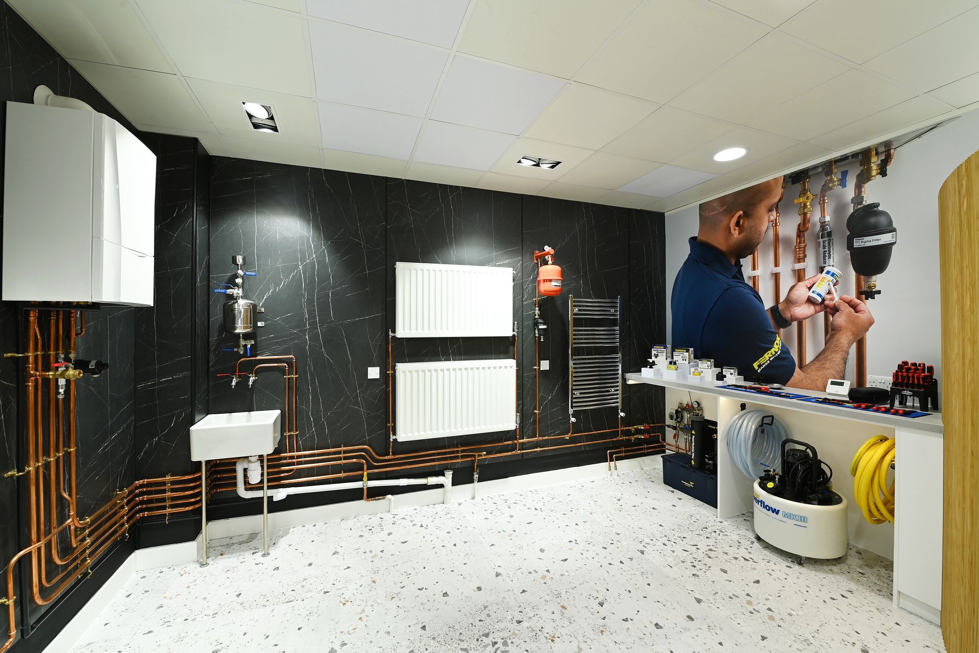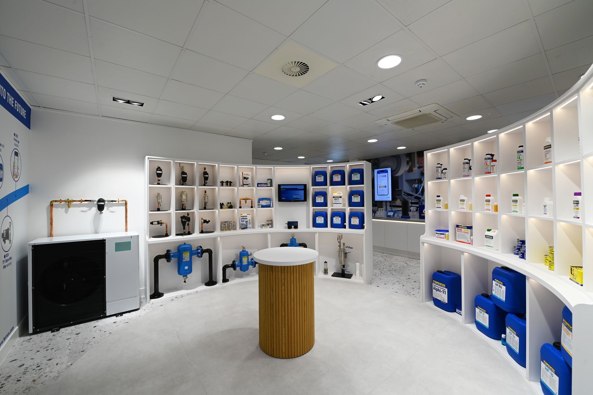 Fernox’s focus on product quality is clearly portrayed in the fit-out of the new space. Durable, stylish and brand-specific detailing and finishes set off the Fernox’s products in a suitably professional setting.